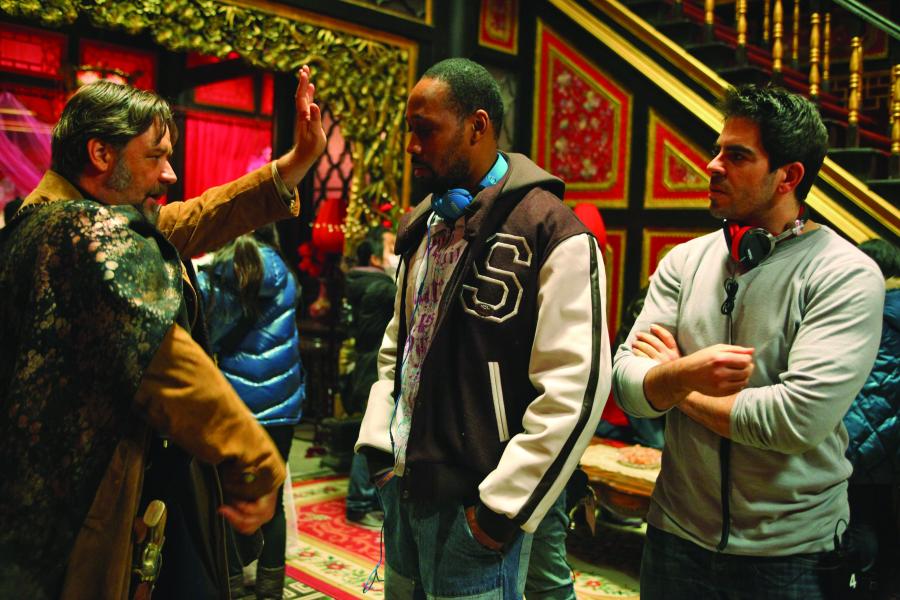 (L to R) RUSSELL CROWE as Jack Knife, RZA and ELI ROTH on the set