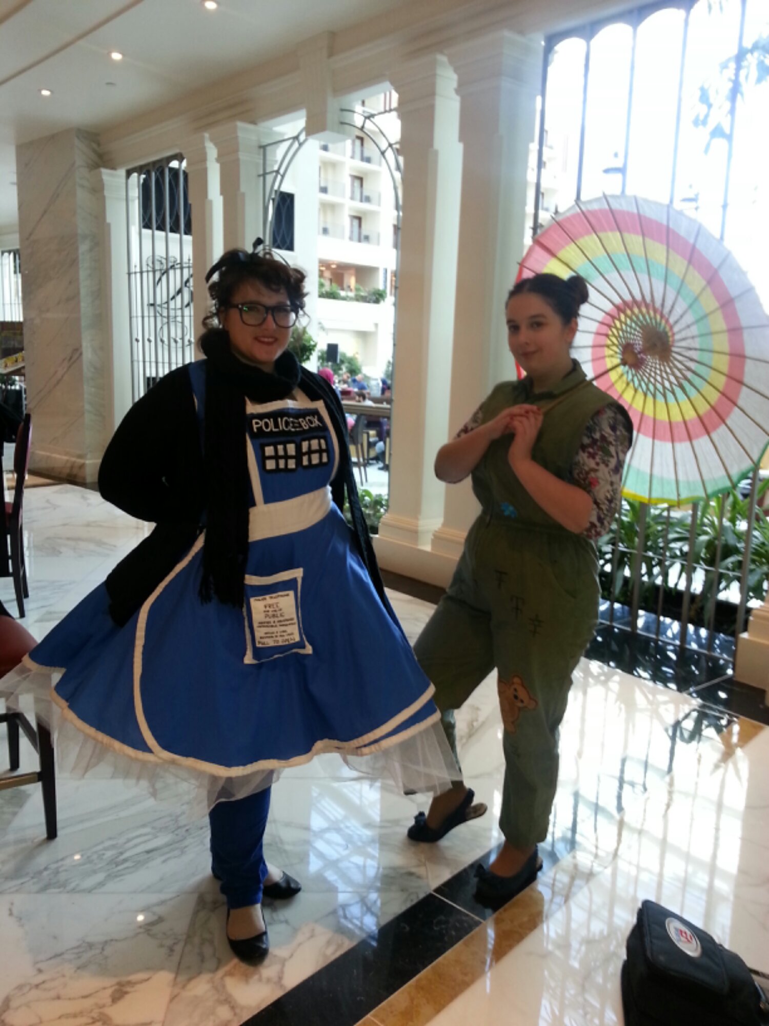 * Making new friends, anywhere and everywhere: you don’t need to sit down over a cup of tea or a beer in order to make friends at a con. Just get in line for something. Or ride the elevator. Or wait for a delayed panel to begin. Tada – before you know it, you’re chatting with whomever is nearby, and because you’re here and they’re here, you’ll have tons to talk about. Favorite anime, best cosplay you’ve seen so far…even how long the line is. Bonus? Those folks you’ve talked to will instantly be your Con-Buddy, and saying hi with a hug whenever you see them/they see you is part of the deal. Hooray!