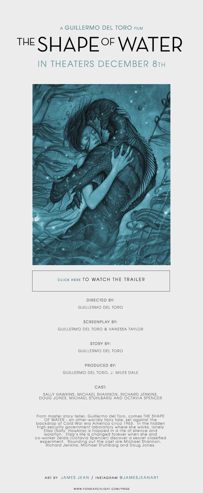 From master story teller, Guillermo del Toro, comes THE SHAPE OF WATER – an other-worldly fairy tale, set against the backdrop of Cold War era America circa 1963. In the hidden high-security government laboratory where she works, lonely Elisa (Sally Hawkins) is trapped in a life of silence and isolation. Elisa’s life is changed forever when she and co-worker Zelda (Octavia Spencer) discover a secret classified experiment. Rounding out the cast are Michael Shannon, Richard Jenkins, Michael Stuhlbarg and Doug Jones.