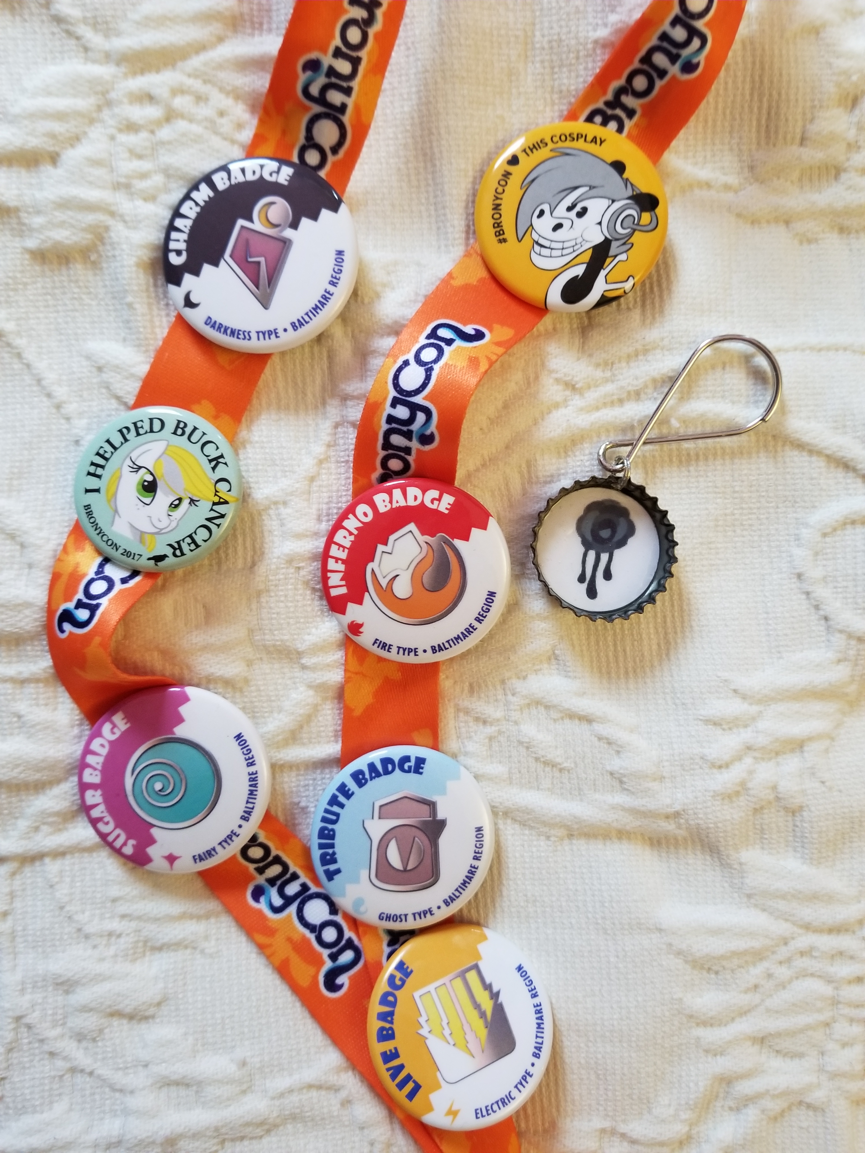 As usual, there was a bunch’a free BronyCon buttons/badges to be had, and this year the staff switched things up by only giving out one out-and-out BronyCon pin. Why? Because there was a hunt afoot y’all! A Pokemon hunt. Yep; I hear tell that there were eight pins to “catch” this year. You had to find a staff member and go through whatever hurdle they had for you (from taking a silly selfie to answering questions about BronyCon) to score ’em. I only wound up with five, but I like to think they’re the best five.