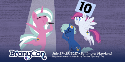 About BronyCon: Based in Baltimore, Md., the tenth iteration of BronyCon is scheduled for July 27-29, 2018 at the Baltimore Convention Center. The convention features special guests, diverse programming, events, and a multi-night music festival featuring 14 hours of live music from some of the greatest fandom musicians. For more information, check out bronycon.org.