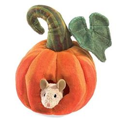 Yes, when I stick my finger into the puppet to get my little mouse to move, it looks like I’ve brought puppet stranger danger to life. It’s the kind of thing children won’t notice, but adults will giggle at. (Well, at the adults I like to hang out with will, at any rate.) But Pumpkin is great for anyone to just cuddle with, as it’s soft, velvety, and easily malleable. It’s also great for popping into your pocket and pulling out for Halloween show-and-tell, a kind of Peter Peter Pumpkin Eater riff. The puppet is the usual high-quality Folkmanis is known for, so the stitching isn’t going to unravel from being handled repeatedly.